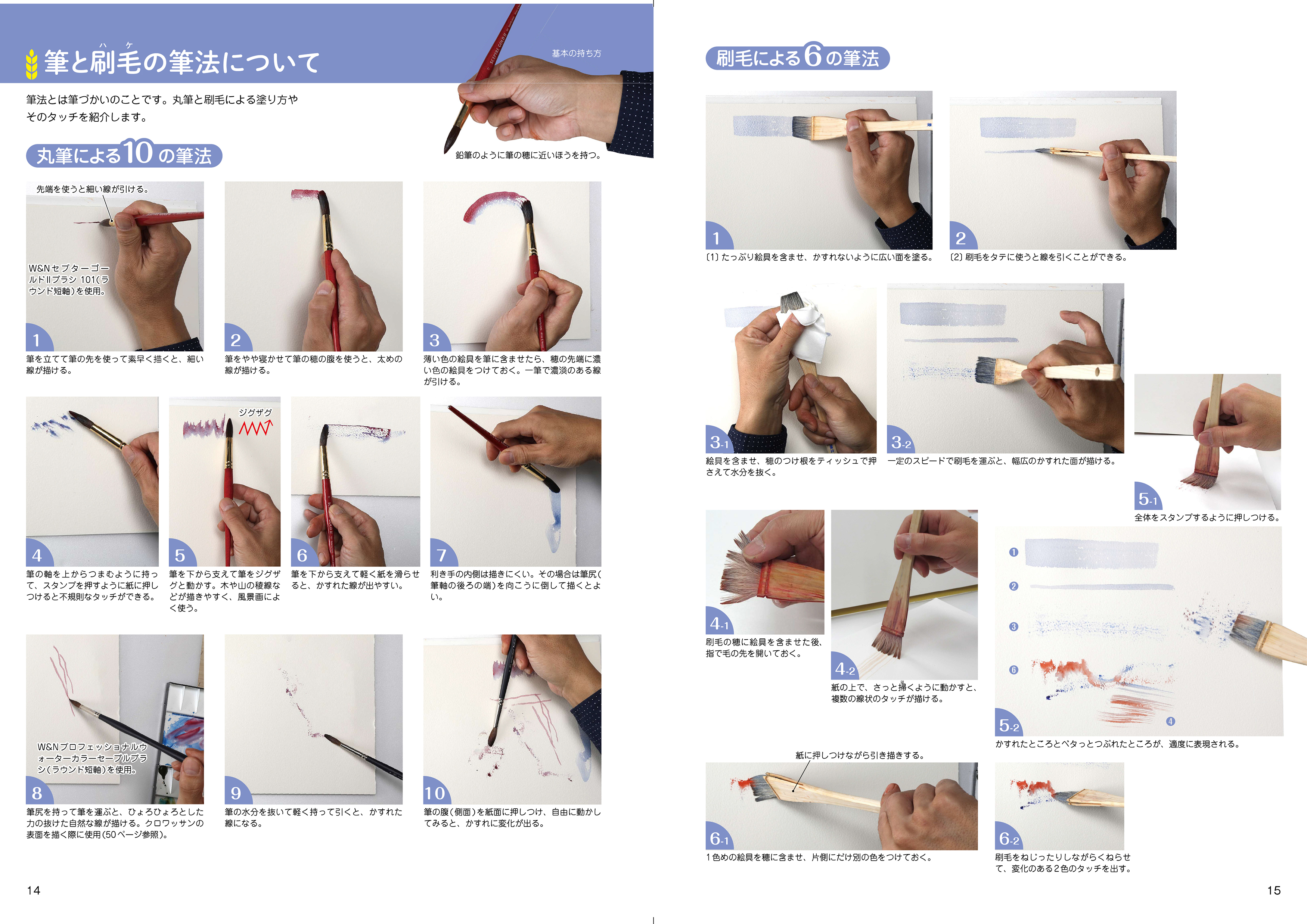 イギリスの伝統ある画材ブランド「ウィンザー&ニュートン」の絵具を使って、にじみ、ぼかし、重ね塗りなどの「透明水彩7つの基本技法」を展開。