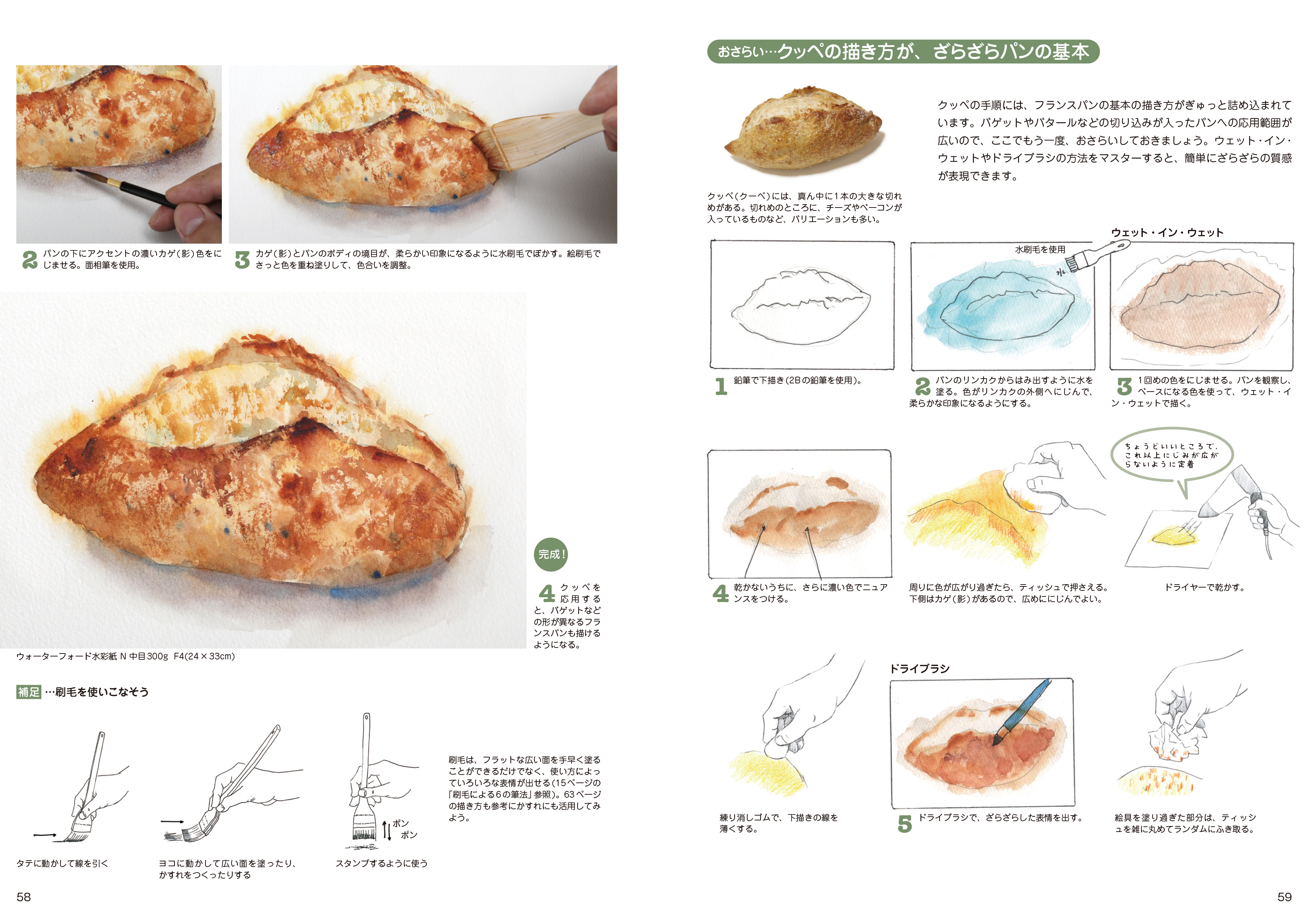 透明水彩 おいしい卓上静物の描き方 つるつる・ざらざら 基本はパンから学ぶ
