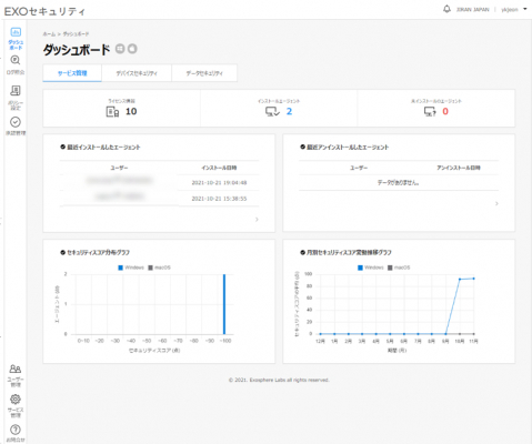 ダッシュボードは。サービス管理・デバイスセキュリティ・データセキュリティで構成されています。