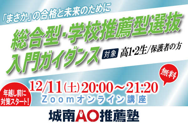 そこで「城南AO推薦塾」では高校1・2年生を対象とし、去る10月・11月にオンラインガイダンスを実施。総合型・学校推薦型選抜の仕組みとポイントを解説するとともに、当校卒業生の合格ストーリーも交え、今すぐ始められる対策法を伝授し、多くの方にご参加いただきました。これを受け、早期対策が有効である総合型・学校推薦型選抜での受験を検討している高1・2生には、年越し前に対策をスタートしてもらいたいという思いから、今回再度追加実施することを決定いたしました。