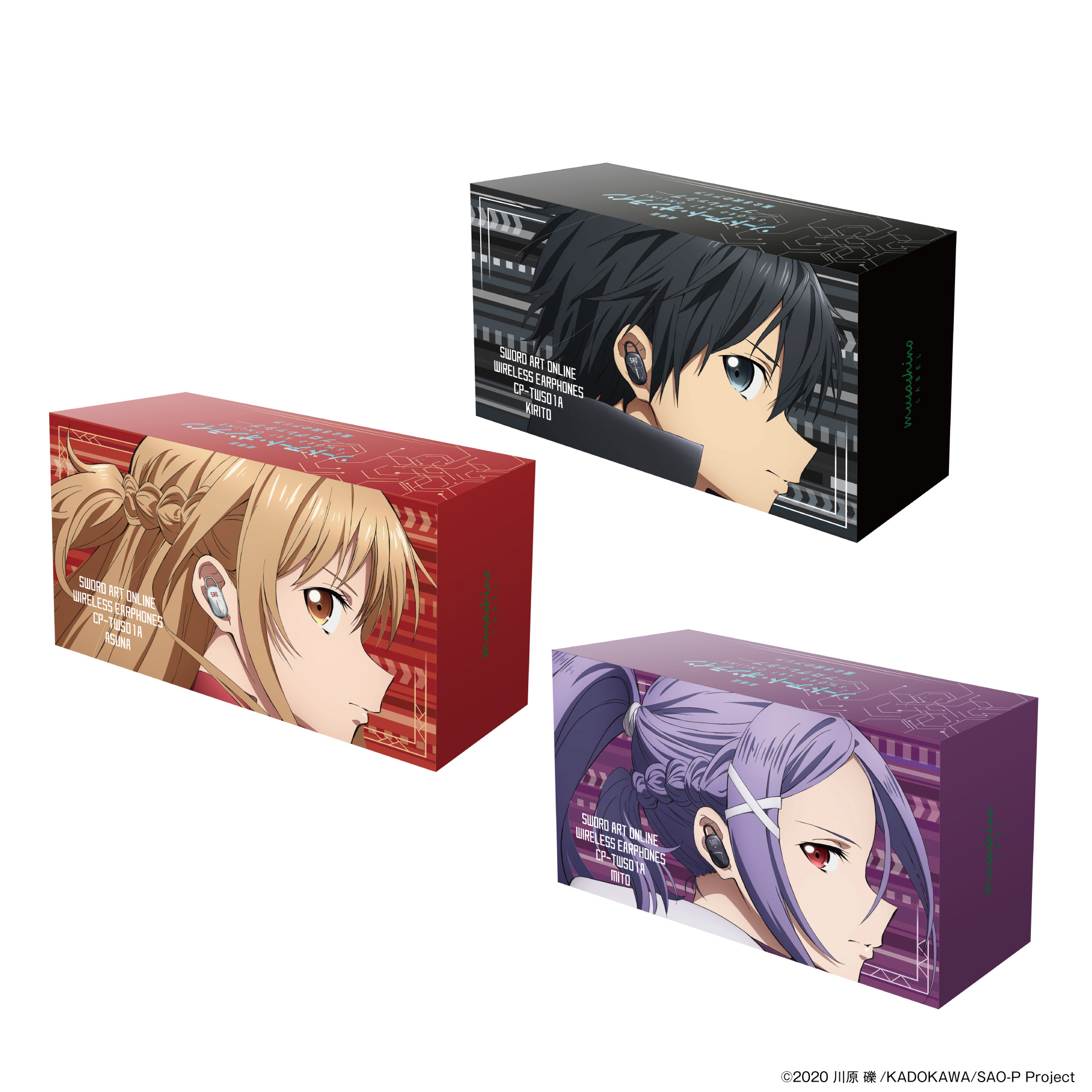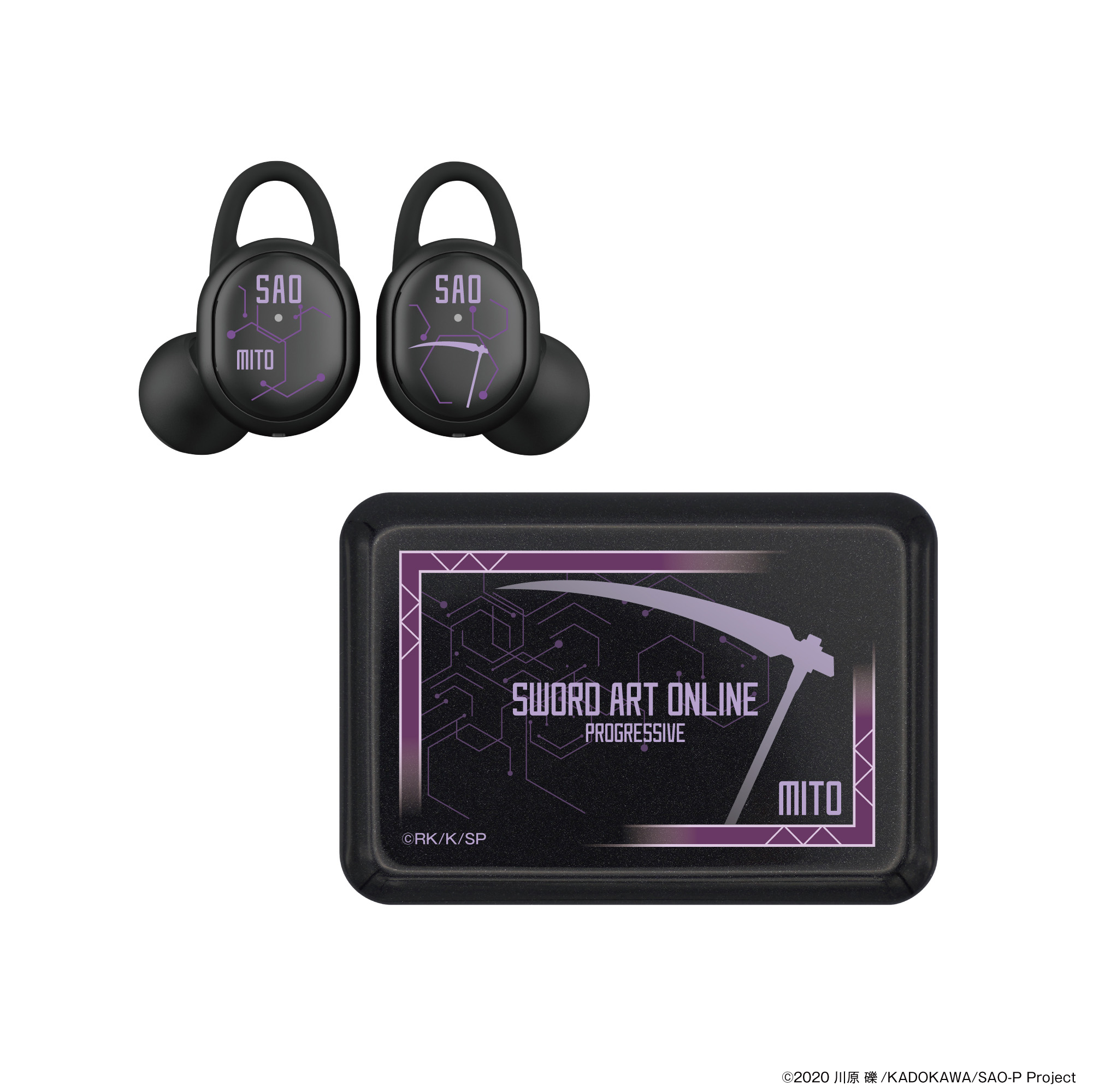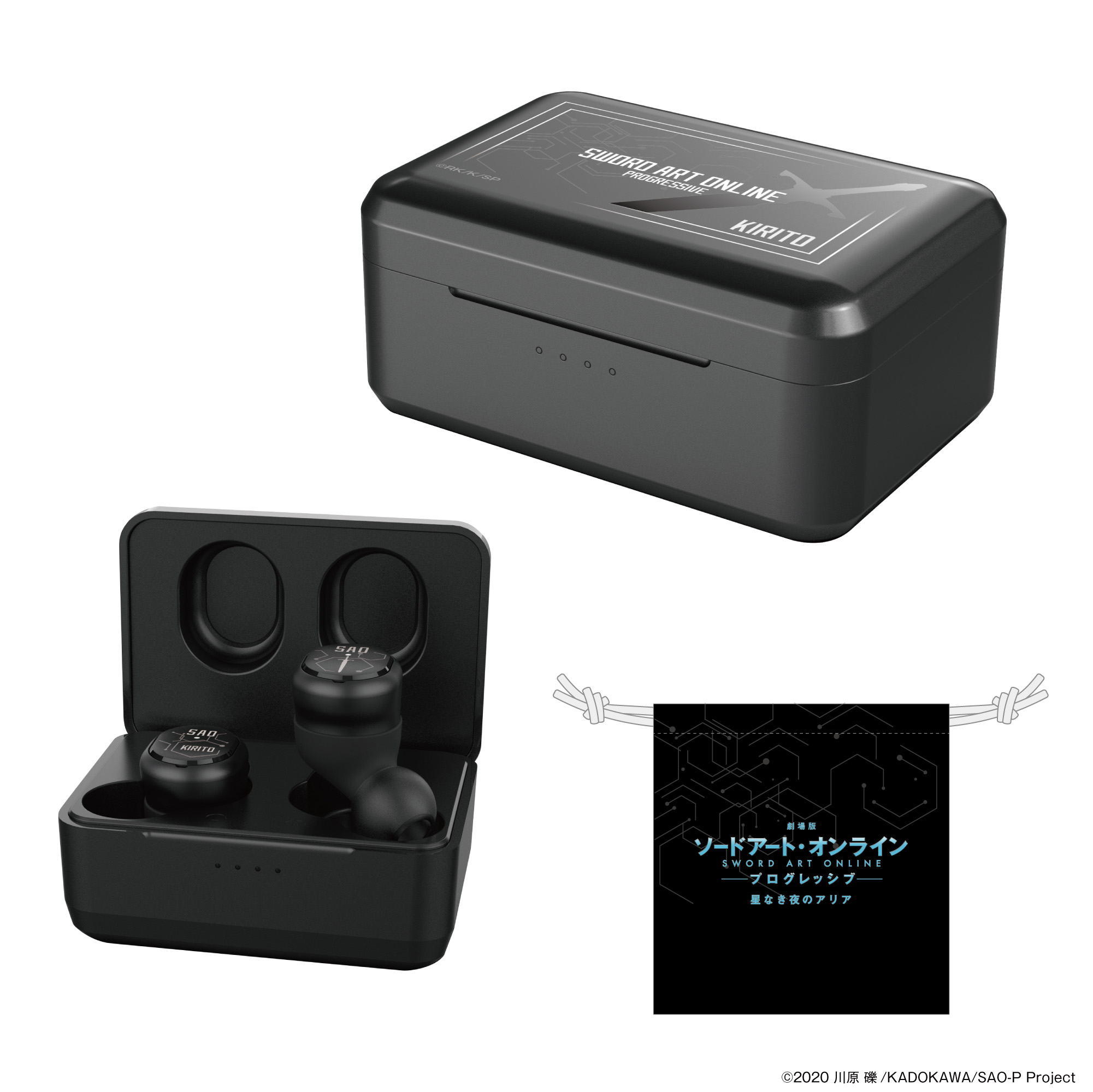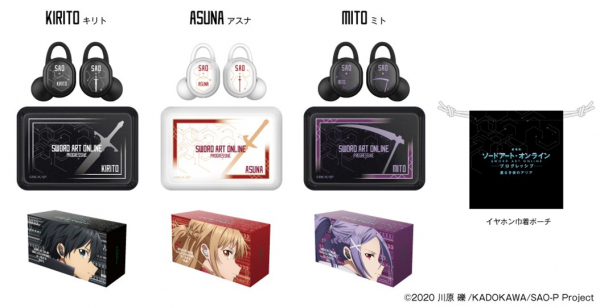 本コラボレーションモデルは、左右のハウジング、充電ケース共に、「キリト」「アスナ」「ミト」それぞれの世界観を表現したオリジナルデザインとなっております。描き下ろしイラストデザインパッケージに、オリジナル巾着ポーチと、描き下ろしイラストポストカードが付属となります。