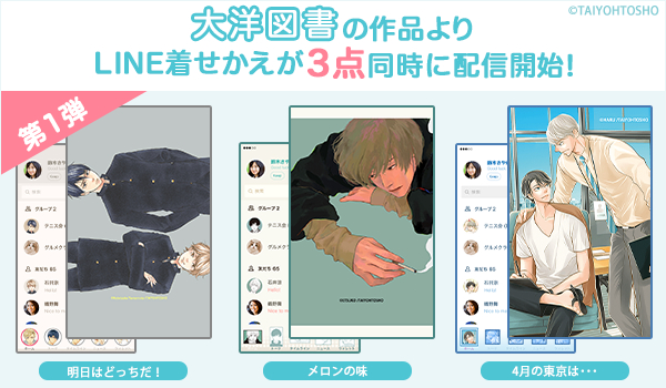 大洋図書×株式会社インクルーズが贈る記念すべきLINE着せかえシリーズ第1弾は、山本小鉄子先生「明日はどっちだ!」、ハル先生「4月の東京は…」、絵津鼓先生「メロンの味」の3作品です!