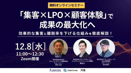 株式会社グラッドキューブ(本社:大阪府大阪市 代表:金島 弘樹 以下当社)は、株式会社ZEALS(本社:東京都目黒区、代表:清水正大)と共催で、12月8日(水)11:00~オンラインセミナーを開催いたします。