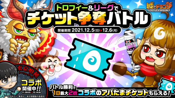 株式会社アソビズム(本社:東京都千代田区、代表取締役:大手智之)は、App Store・Google Playにて好評配信中の『城とドラゴン』で、「トロフィー&リーグでチケット争奪バトル」を2021年12月5日(日)より開催いたします。