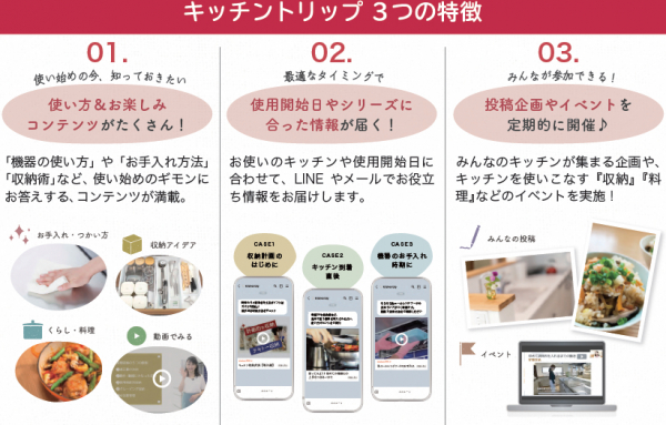 新しいシステムキッチンを、快適に使いこなしてほしいとの思いから生まれた「kitchen trip」は、購入一 年目で戸惑うことの多い、新しい機能の使い方、収納術、お手入れ方法などを、適時配信します。