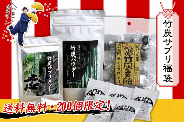 竹炭サプリ福袋を販売開始しました。国産の最高級竹炭パウダーと最高級竹炭サプリメント、高知県産ショウガを使用した竹炭生姜飴、ミニ竹炭石鹸をセットにしたお得な福袋です。通常価格3,984円(税込)のところ、25%OFFの2,999円(税込)でお届け。限定200個の商品ですのでお早めにお買い求めください。