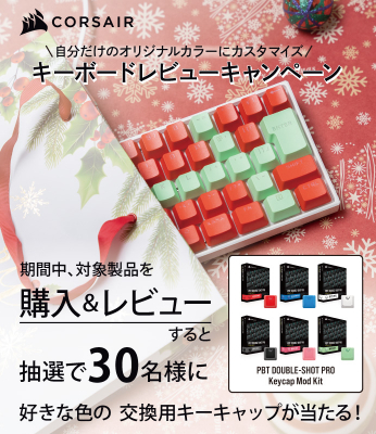 株式会社リンクスインターナショナル(本社:東京都千代田区、代表取締役:川島義之)は、2021年12月10日(金)~2022年1月10日(月)の期間中に対象のCORSAIR製キーボードを購入&レビュー投稿すると、抽選で合計30名様に好きな色の交換用キーキャップ「PBD DOUBLE-SHOT PRO Keycaps」が当たるキャンペーンを実施いたします。