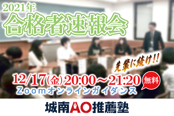 2021年12月17日(金)、株式会社城南進学研究社(所在地:神奈川県川崎市・代表取締役CEO:下村勝己)が運営する総合型選抜(旧AO入試)・学校推薦型選抜(旧推薦入試)対策専門塾「城南AO推薦塾」は、今秋行われた入試で合格した当校生徒によるオンラインガイダンス「2021年合格者速報会」を実施いたします。