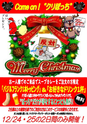 12月24、25日は恋人と過ごす至福の時。しかし、そんなクリスマスにも一緒に食事をする相手がいない人が男性でも女性でもいるはずです。お江戸スープカレーちゃはや庵のシェフ(男性)は「クリぼっち」歴22年。誰よりも孤独を愛し、理解するシェフから「クリぼっち」のお客様へのプレゼントです。
