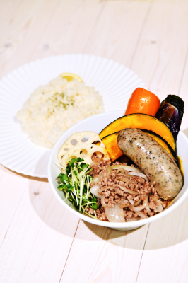本フェアで無料のバジルフランクソーセージは、1本の太さ3cmで長さは約12cmなので、ボリューム満点!ですがさわやかなハーブのおかげで、これだけボリュームがあってもさっぱりと食べ進められるお江戸スープカレーちゃはや庵の人気商品です。トッピングは他にも、紅しょうが串(100円)、白身魚のフライ(170円)、ビフテキ(130g)420円、豚の角煮(100g)420円、鶏レッグ360円など、@100円から多数ご用意しています。