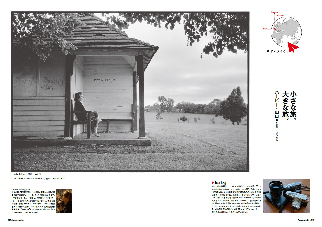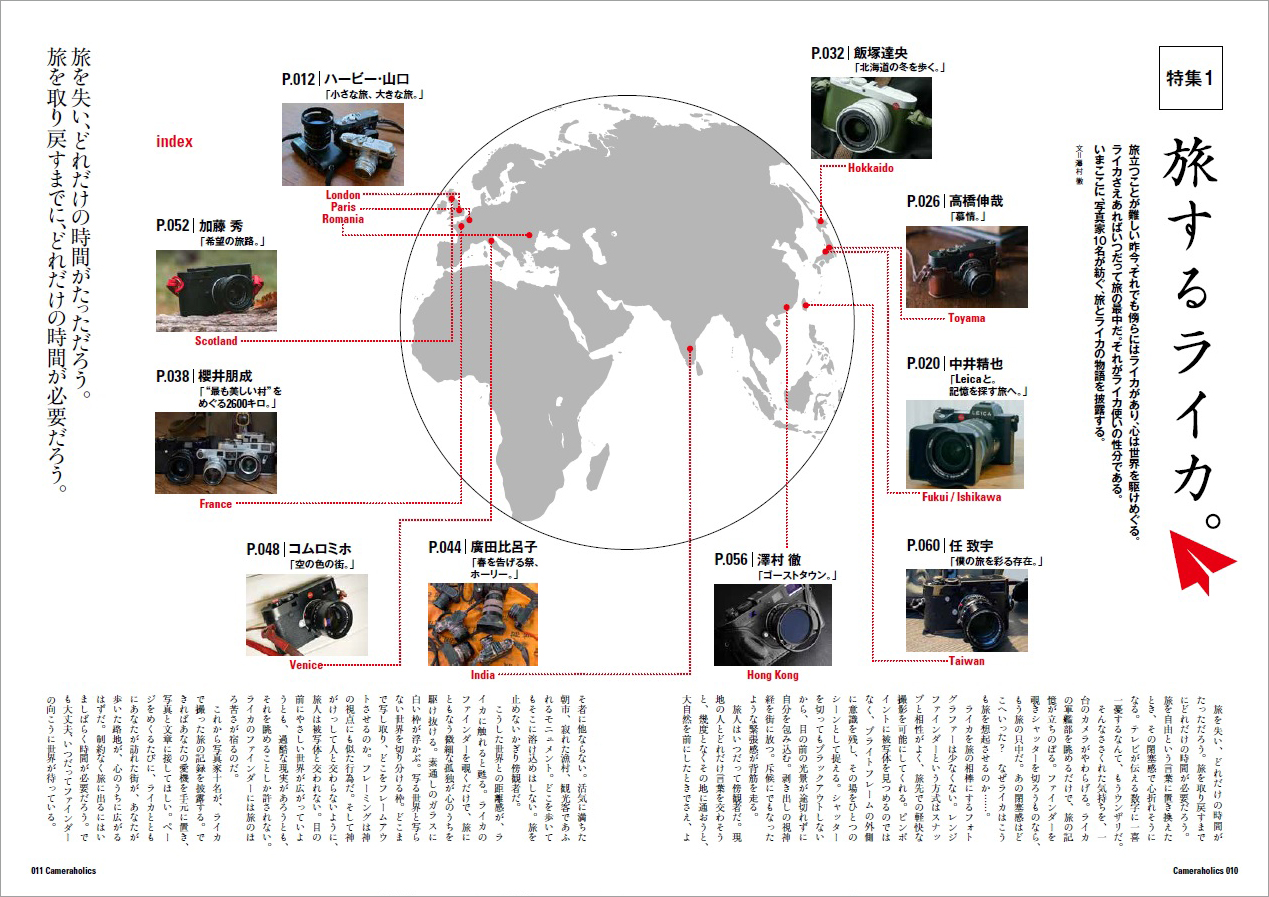 今回は、写真家たちがライカで撮影した、世界各地、日本各地の 旅の写真を、その使用機材とともに紹介・解説する第1特集「旅するライカ」と、先日35ミリが登場して盛り上がりをみせる、第2特集「アポ・ズミクロン大集結」の二大特集でお届けします。