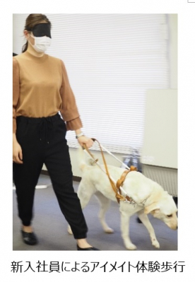 その後、アイメイト協会のスタッフの方より新入社員にアイメイト協会の歴史や視覚障がい者の自立と社会参加のお手伝いに重きをおいて事業を行っていること等をご説明いただいた上で、新入社員がアイマスクをつけてアイメイトとの歩行を体験しました。