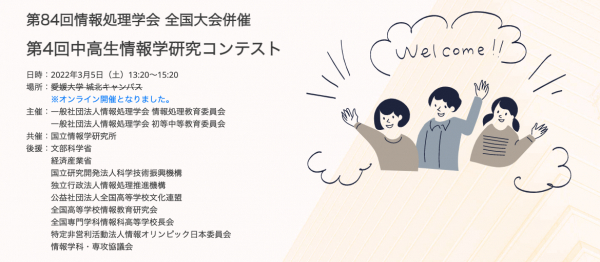 一般社団法人情報処理学会(会長:徳田英幸)は、2022年3月5日に「第4回中高生情報学研究コンテスト」(第84回全国大会併催)を開催します。