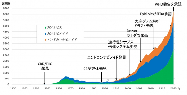 図:医学文献データベース「PubMed」による大麻関連研究の論文数推移