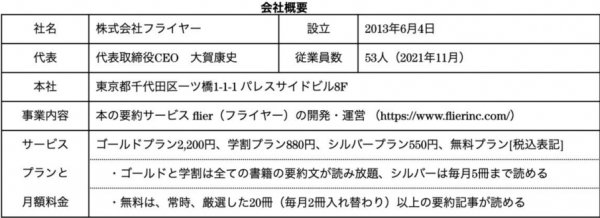 (株)フライヤーは、本の要約サービス「flier(フライヤー)」を運営する、ITベンチャー(2013年6月設立)です。最大の特長は「書評(レビュー)」ではなく「要約」である点です。書き手の主観が入る書評とは異なり、著者の主張や論理(重要ポイントや全体像)を忠実にまとめ、読者に伝えます。書評でないため、出版社と著者から要約の許可を得る必要があり、要約した原稿にも目を通していただくことで、高品質なサービスを提供しています。