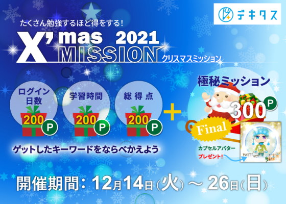株式会社城南進学研究社(本社:神奈川県川崎市、代表取締役:下村勝己)が運営する小中学生対象のオンライン学習教材「デキタス」は、2021年12月14日(火)から12月26日(日)に、クリスマス限定イベント『クリスマスミッション2021』を開催いたします。