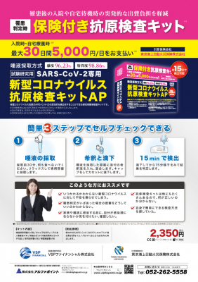 株式会社アルファポイント (所在地:愛知県名古屋市中区大須3丁目30-40 万松寺ビル10F 代表取締役:丸山和之、以下アルファポイント)は、東京海上日動火災保険株式会社(所在地:東京都千代田区丸の内一丁目2番1号)が引受保険会社である特定感染症補償付き抗原検査キットAPの販売を2021年12月20日(月)より開始いたします。