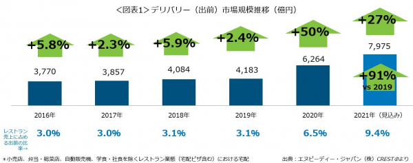 レストラン業態(小売店、自販機、社員食堂、学生食堂を除く。宅配ピザを含む)におけるデリバリー(出前)市場規模は、2021年(1-12月計)に約7975億円になる見込みで、前年と比べ27%程度増加することが見込まれます(図表1)。2019年比では91%増とコロナ前の2倍近くの規模となります。売上に占める比率は9.4%程度となりそうです。