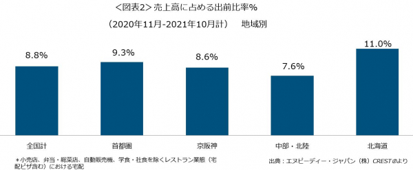 外食業態で、イートイン、テイクアウト、デリバリーとある中、デリバリーの売上に占める比率(図表2)は、直近1年間(2020年11月-2021年10月計)で8.8%でした。地域別に主要地域を比較すると、首都圏は9.3%でした。北海道は特に高く、11.0%でした。