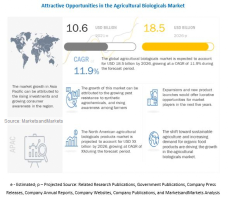 MarketsandMarketsはレポートの公開資料において、農業用生物学的製剤市場価値は2021年に106億ドル、2026年までには185億ドルに達し、CAGR11.9%で成長するとの予測結果を発表しました。農業用生物学的製剤市場は自然農法を採用しているケミカルフリーの食品を生産する農家の間で重要性が拡大しています。