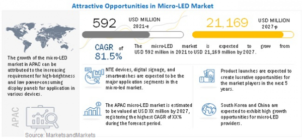 MarketsandMarketsはレポートの公開資料において、マイクロLED市場は2021年に5億9,200万ドル、2027年には211億6,900億ドルへ達し、2021年から2027年までにCAGR81.5%で成長するとの予測結果を発表しました。予測期間中のマイクロLED市場の成長を加速させる製品としてはNear-to-Eye(NTE)機器とプレミアムスマートフォンを挙げています。