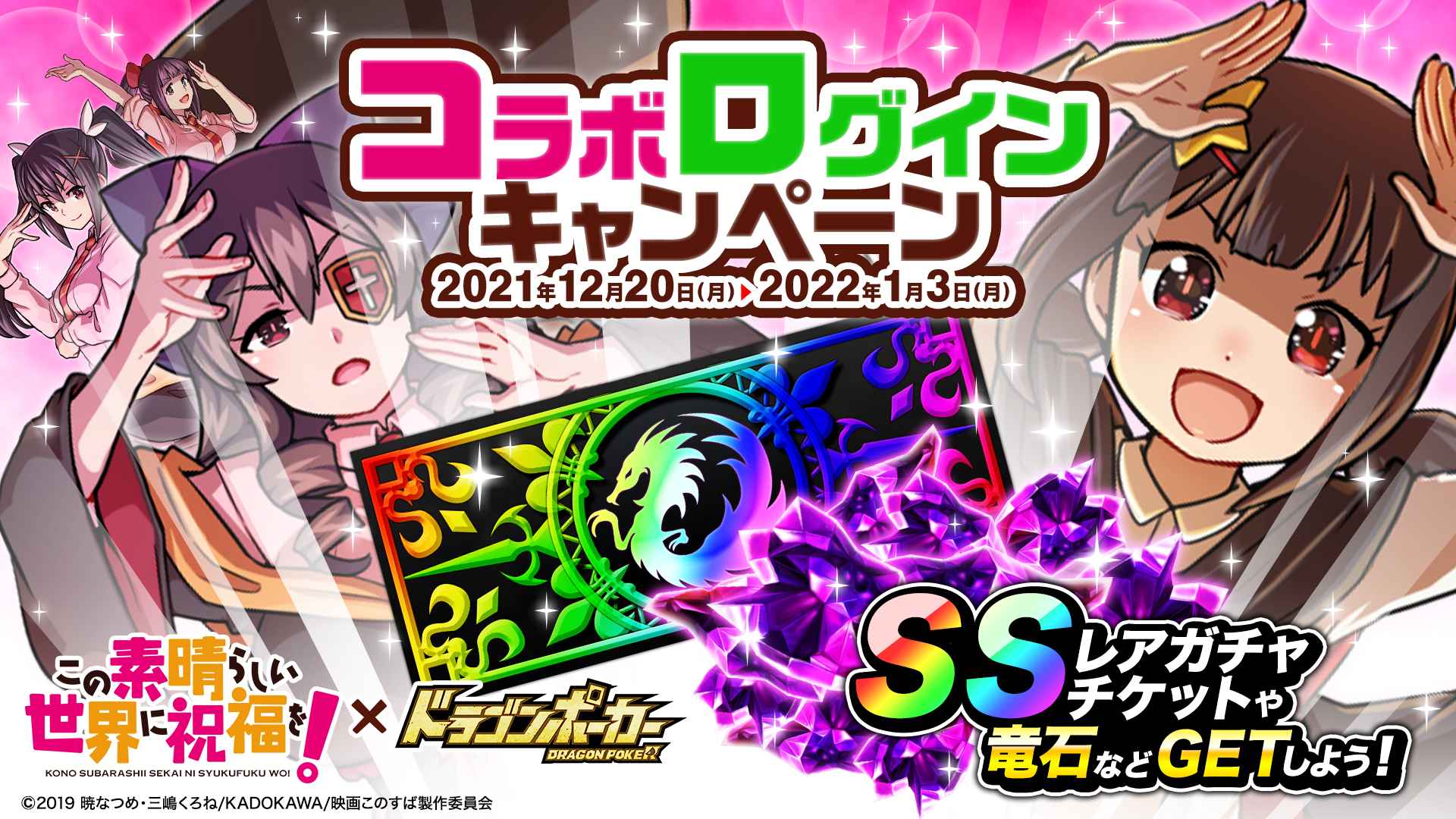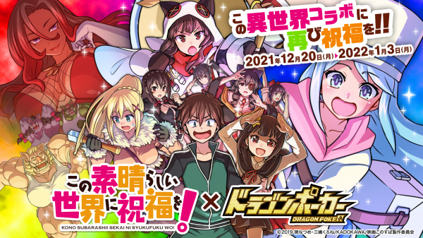 株式会社アソビズム(本社:東京都千代田区、代表取締役:大手智之)は、App Store・Google Playにて好評配信中のリアルタイム合体カードバトル『ドラゴンポーカー』で、2021年12月20日(月)よりアニメ『この素晴らしい世界に祝福を!』との復刻コラボイベントを開催いたします。