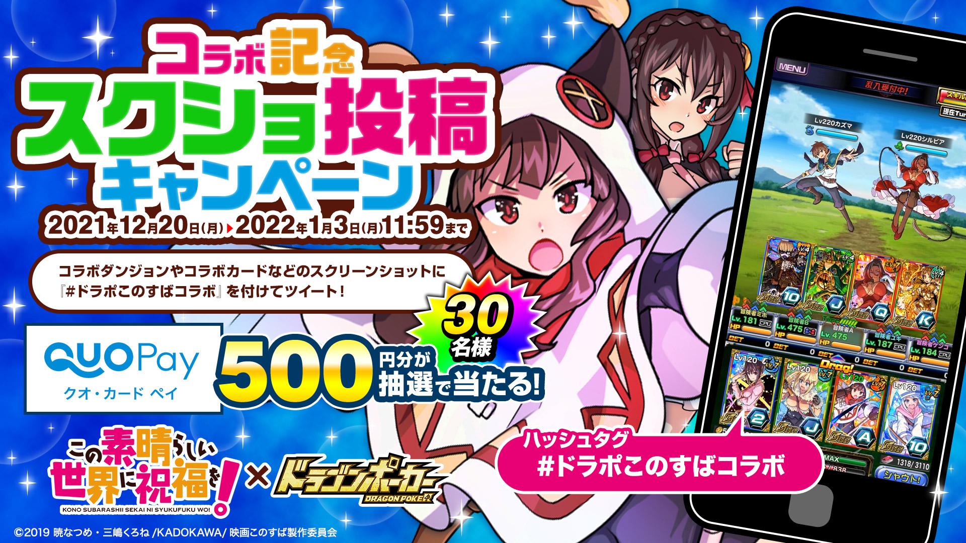 期間中、コラボダンジョンやコラボカードなどのスクリーンショットや動画に『#ドラポこのすばコラボ』を付けてツイートすると、抽選でQUOカードPayをプレゼント!ふるってご参加ください。