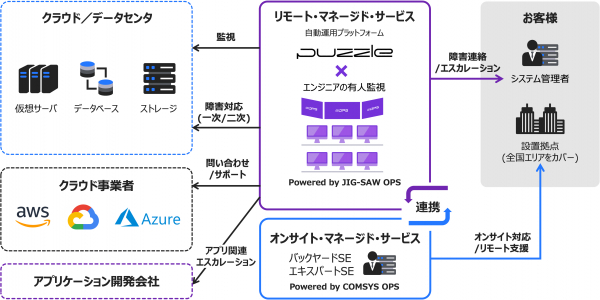 日本コムシスはサーバーやネットワーク機器の障害時にオンサイトで駆け付ける保守サービスを、JIG-SAWはサーバーやマルチクラウドをリモート監視・運用する「JIG-SAW OPS*」を提供しており、両社のサービスを活かした【ワイドエリアサポートサービス】を立ち上げました。