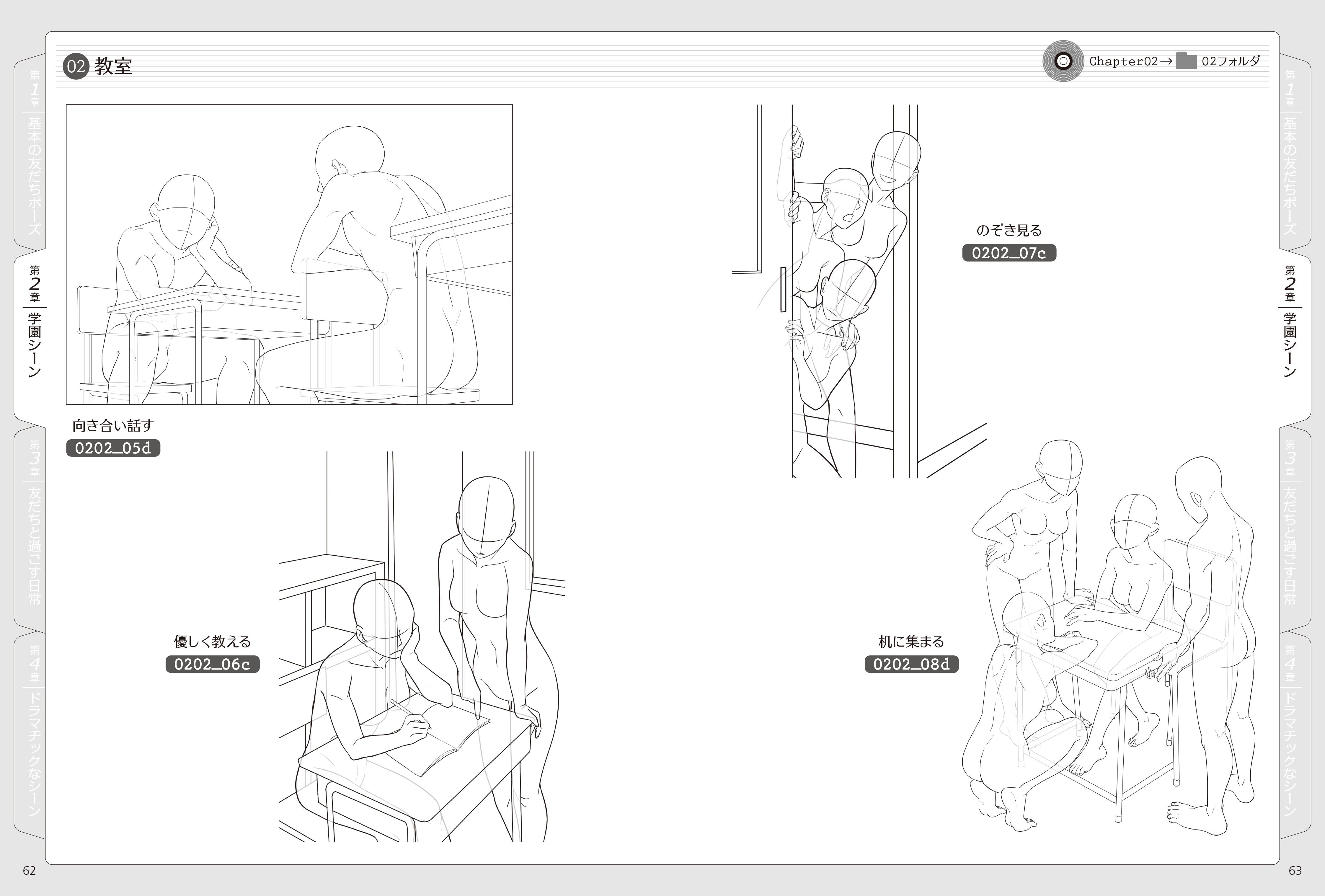 本書は「基本のポーズ」「学園シーン」「日常シーン」「ドラマチックなシーン」の4章構成。