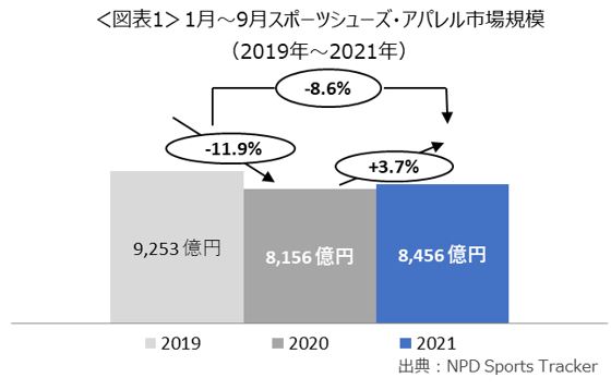 日本の2021年1-9月のスポーツシューズ・アパレル市場規模は8,456億円で前年同期比3.7%増と、新型コロナウイルスの影響からの緩やかな回復を見せました(図表1)。ただし2019年同期比では8.6%減で、まだコロナ以前の水準には回復していないことが分かります。