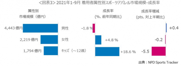 属性別に見ると(図表3)、キッズが前年同期比18.6%増と大きく成長しました。ただし上半期の24.1%増から比べると5.5ポイント減少しており、学校のクラブ活動再開などで一時的に回復していた需要が一巡し落ち着いてきていることを示唆しています。一方1.8%減とマイナス成長が続いている男性ですが、上半期の2.2%減からは減少率が0.4ポイント低下しており、回復の兆しも見せています。