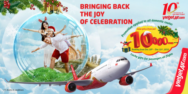 (東京、2021年12月21日) - ベトジェットでは、就航10周年と祝祭シーズンを記念して、ベトナム国内線全路線において10,000ドン(*)(約50円)からの特別キャンペーン運賃を設定しました。