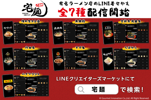 記念すべき第1弾シリーズは、「俺の生きる道 白山店」 「無鉄砲」 「吉祥寺 武蔵家」 「横浜家系ラーメン 作田家」 「スタミナ満点らーめん すず鬼」 「ちばから」「ハイマウント」の7店舗が7点のLINE着せかえとなって一斉に新登場です!是非、LINEをお気に入りのラーメンに着せかえてみてください。