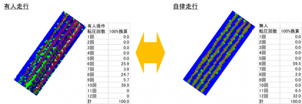 さらに、自律走行と有人作業とを比較するため、試験エリア内で規定転圧回数を6回(ラップ箇所は12回)、横断方向に5レーンを設定致しました。