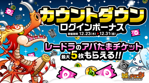 12月23日(木)メンテナンス後より、ゲームにログインすると、“レードラのアバたまチケット”が最大5枚もらえる「カウントダウンログインボーナス」を開催します。報酬は期間中1日1回、最大9日間プレゼントされます。