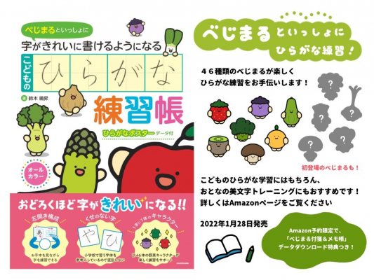 ネット発SNSキャラクターのプロデュース専門会社であるエイノバ株式会社(本社:東京都千代田区、代表取締役社長:安倍義人)に所属するクリエイター「うめぼしちゃん」が、この度株式会社KADOKAWA(東京都千代田区、代表者:夏野剛)が発売する書籍「べじまるといっしょに字がきれいに書けるようになるひらがな練習帳」にイラスト採用され2022年1月28日に発売開始しました。書籍では作家うめぼしちゃんによる描き下ろしイラストが満載。可愛らしい野菜の妖精「べじまる」達がひらがな練習を楽しく彩ります。