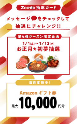 「Zeetleのお正月☆初夢抽選」と題し、1万円相当の「おいしい肉ギフトカード 10,000(デジタル)10000円」を抽選で5名の方に、5千円相当の「おいしい肉ギフトカード 5,000(デジタル)5000円」を抽選で10名の方に、1500円相当のグルメ(麺類、レトルト、スイーツ、米等)を抽選で50名の方にプレゼントします。抽選期間は2022年1月1日(土)~1月12日(水) です。2022年も、ユーザー様にポイ活を楽しんでいただけるよう、継続的に季節のキャンペーンを実施して参ります。2022年もZeetleをよろしくお願いいたします。