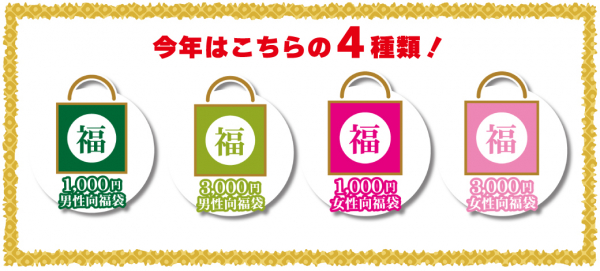 今年の福袋は全部で4種類。男性向け・女性向けの福袋に、それぞれ1,000円分・3,000円分をご用意しました。