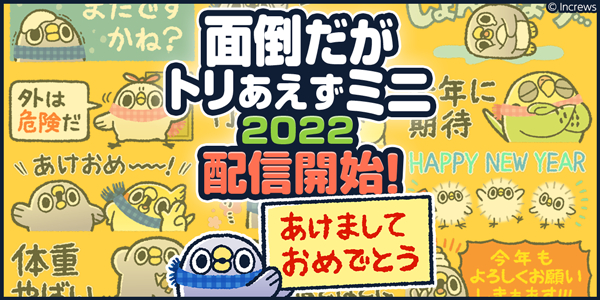 株式会社インクルーズ(東京都渋谷区、代表取締役社長 山﨑 健司)は、LINE株式会社(東京都新宿区、代表取締役社長 出澤 剛)が運営するコミュニケーションアプリ「LINE」内のスタンプショップにて、「面倒だがトリあえずミニ 2022」を2021年12月26日(日)に配信致しました。