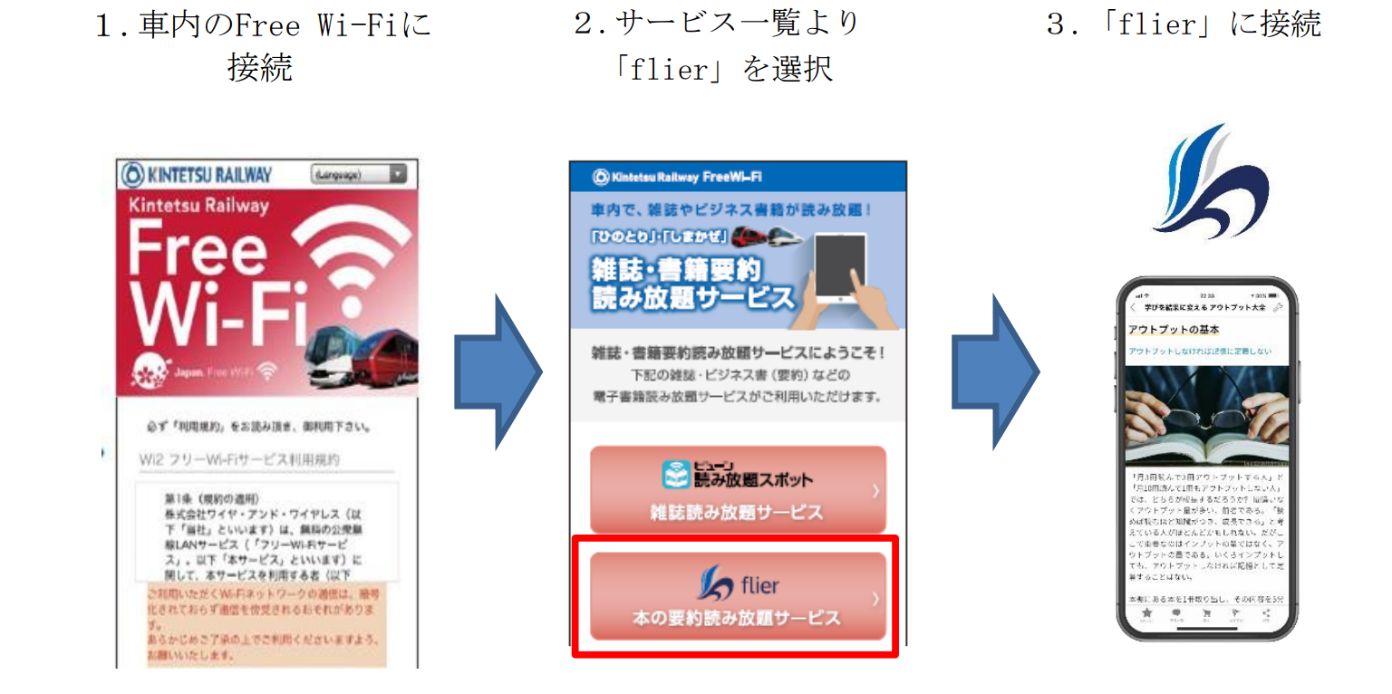「ひのとり」「しまかぜ」の全ての車内で、ビジネスや学びに役立つオンラインコンテンツを無料で楽しめるサービスの中で、「flier」の公開している全ての書籍の要約が読めるようになります。