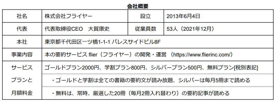 (株)フライヤーは、本の要約サービス「flier(フライヤー)」を運営する、ITベンチャー(2013年6月設立)です。最大の特長は「書評(レビュー)」ではなく「要約」である点です。書き手の主観が入る書評とは異なり、著者の主張や論理(重要ポイントや全体像)を忠実にまとめ、読者に伝えます。書評でないため、出版社と著者から要約の許可を得る必要があり、要約した原稿にも目を通していただくことで、高品質なサービスを提供しています。