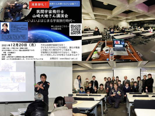 世界中の人々の夢を宇宙で実現させる民間宇宙サービスプラットフォームを提供する宇宙ベンチャー企業株式会社ASTRAX(アストラックス、以下 ASTRAX、本社:神奈川県鎌倉市、代表:代表取締役・民間宇宙飛行士 山崎大地)の代表で民間宇宙飛行士の山崎大地が広島県福山市で講演を行い、そしてその参加者との交流会を実施し、大変好評をいただきました。