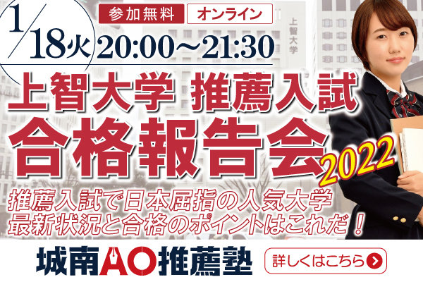 2022年1月18日(火)、株式会社城南進学研究社(所在地:神奈川県川崎市・代表取締役CEO:下村勝己)が運営する総合型選抜・学校推薦型選抜対策専門塾「城南AO推薦塾」は、上智大学の推薦入試について、最新の状況に基づいて解説するガイダンス「上智大学 推薦入試合格者報告会2022」を開催します。