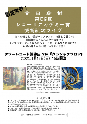スリーシェルズは、第59回レコードアカデミー賞を受賞したCD「いつか聞いた歌」(発売:スリーシェルズ)を記念して、2022年1月16日15時からタワーレコード渋谷店7階クラシックフロアにて、會田瑞樹を招いてインストアライヴを行うことを2021年12月28日に発表しました。