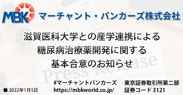 マーチャント・バンカーズ株式会社は、2022年1月4日付で、国立大学法人滋賀医科大学(以下、滋賀医科大学といいます。)と産学連携のプロジェクトとして糖尿病を完治する治療薬の研究開発に取り組むために、共同研究講座を設置することにかかる検討を開始することについて、基本合意いたしましたので、お知らせいたします。