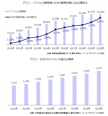 過去10年の推移をみると、2010年においては14,312億円であったベトナムとの貿易額は、2020年においては41,810億円と3倍近くに拡大しています。また、日本の貿易総額に占める構成比も1.12%から3.07%へ増加していることを鑑みると、貿易相手国としての重要性が年を追うごとに高まっていることが分かります(グラフ1「ベトナムとの貿易額と日本の貿易総額に占める構成比」参照)。