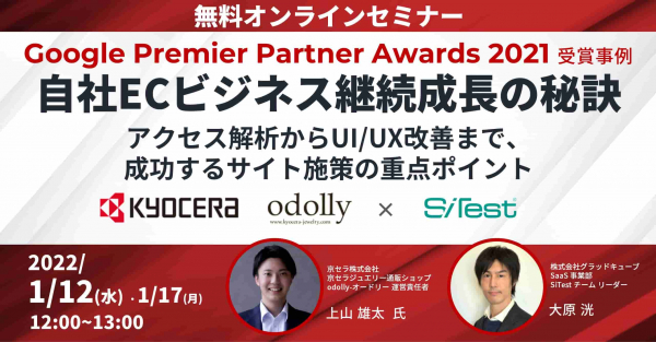 京セラジュエリー通販ショップ odolly 運営責任者 上山さまをゲストに、 当社が独自開発するアクセス解析ツール SiTest(サイテスト)の活用も評価された Google Premier Partner Award 2021「オンライン販売部門」を受賞した成功事例を余すことなくご紹介します。