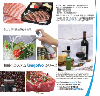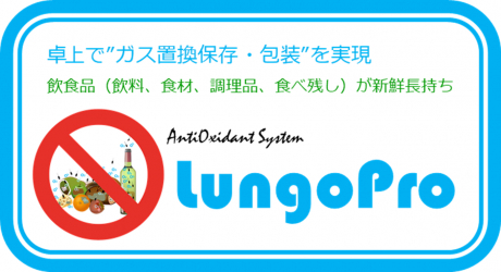 「ガス置換包装」は飲食品の安全なロングライフ化に有効な技術と考えられますが、大掛かりなシステムを必要とし、また使用者が開封した後は空気保存になるため、ご家庭を含む小規模の施設でも導入でき、また開封後の飲食品や調理品の保存にも簡単にガス置換できる「抗酸化システム ルンゴプロシリーズ」を開発しました。