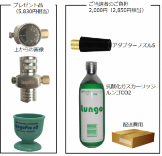 このたび医療機器・食品装置を開発する株式会社バルクレップインターナショナル(東京都渋谷区、代表 向 英俊)は飲食品を酸化、カビを含む微生物から守るガス置換包装を卓上で実現する抗酸化システムの廉価版のダイヤル式レギュレーター(計5,830円相当)を食品に関わる個人事業者50名様にプレゼントします。ただし、それを使用するために必要なノズルと消耗品の抗酸化ガスカートリッジルンゴCO2の費用と送料の合計(2,850円)の一部(2,000円)をご負担いただくことが条件です。
