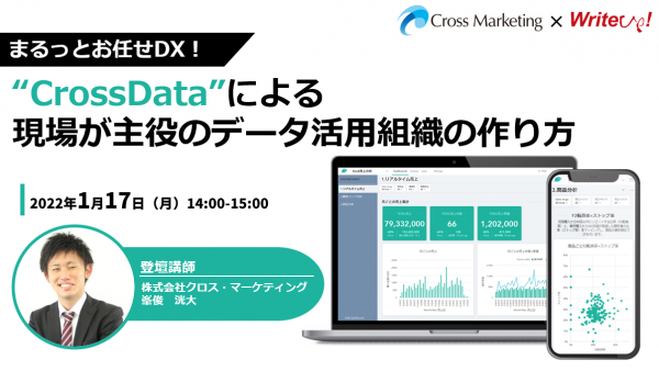 株式会社ライトアップ(本社:東京都渋谷区、代表取締役社長:白石崇、以下ライトアップ)と、株式会社クロス・マーケティング(本社:東京都新宿区、代表取締役社長兼CEO :五十嵐幹、以下クロス・マーケティング)は、自社のデータ活用に悩む企業向けにクロス・マーケティング独自のクラウドBIツール「CrossData」をご紹介するオンラインセミナーを共同で開催いたします。